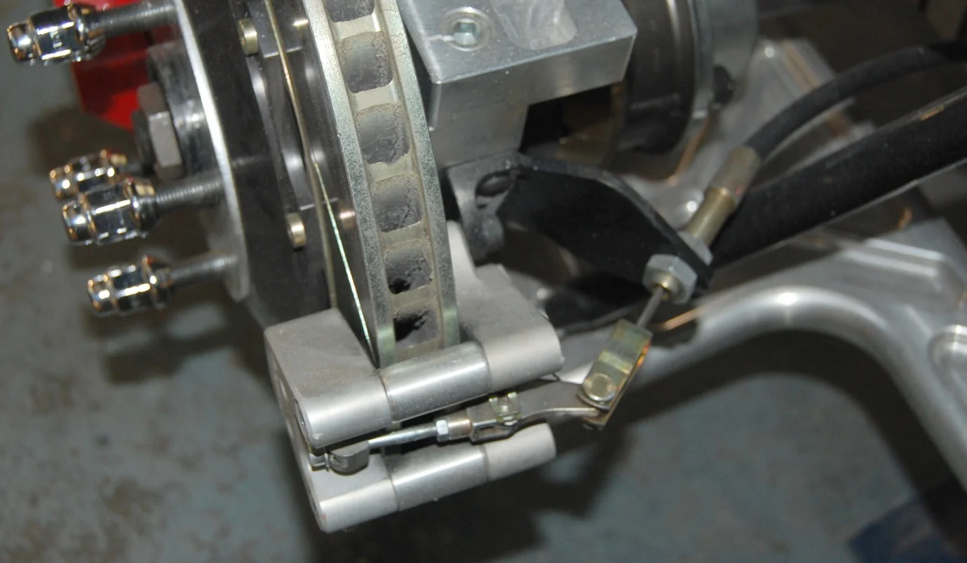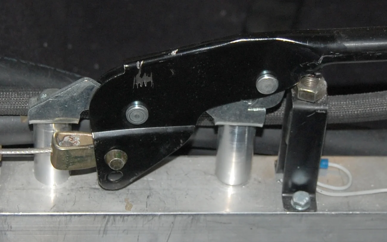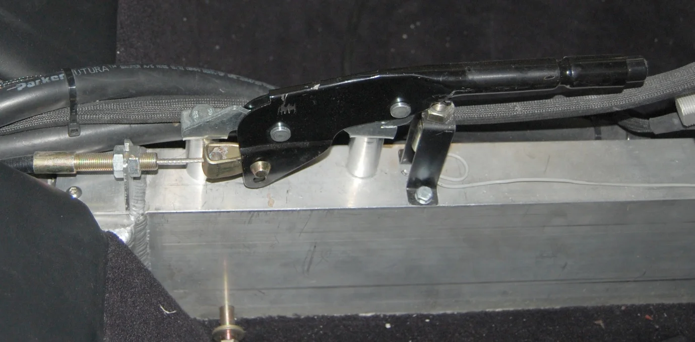 The brake lever can be mounted on the center spine as is shown here, or beside the driver’s seat between the seat and the outside edge of the chassis.